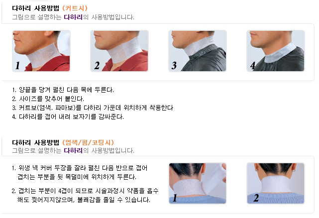 | 사용방법:1. 제품이 풀리는쪽이 아래로 가게하여 다하리 전용상자에 넣은후 1회분을 잘라 양쪽끝을 잡고 길게 펼쳐 고객이 목을 감싸고 커트보를 착용한다. 커트작업이 끝난후에는 넥커버를 먼저 뽑아내고 커트보를 정리한다. 사용방법:2. 샴푸시 1회분을 잘라 아이패드처럼 고객의 눈에 얹은다음 젖은 손가락 두개로 끝부분을 터치하면 고정이 되어 샴푸작업을 쉽게할수 있다. |