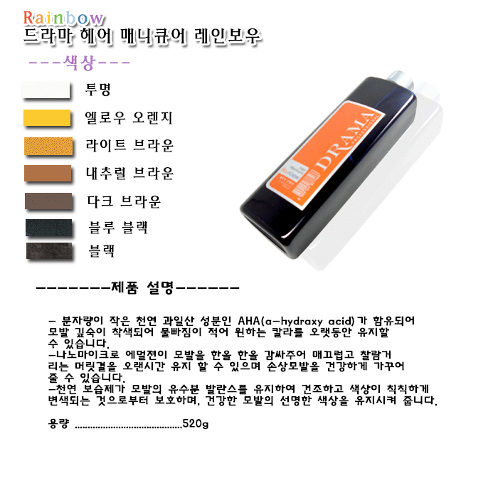 | 무지개처럼 선명하고 아름다운 칼라로 자신만의 개성을 마음껏 연출할 수 있으며 모발에 손상없이 선명하고 윤기있는 색상이 오래 유지되는 신개념의 헤어 매니큐어입니다. 분자량이 작은 천연 과일산 성분인 AHA가 함유되어 모발 깊숙히 착색되어 물빠짐이 적어 원하는 칼라를 오랫동안 유지할 수 있습니다. 나노마이크로 에멀전이 모발을 한올 한올 감싸주어 매끄럽고찰랑거리는 머릿결을 오랜시간 유지하여 건조해지고 색상이 칙칙하게 변색되는 것으로부터 보호하여 , 건강한 모발의 선명한 색상을 표현합니다. |