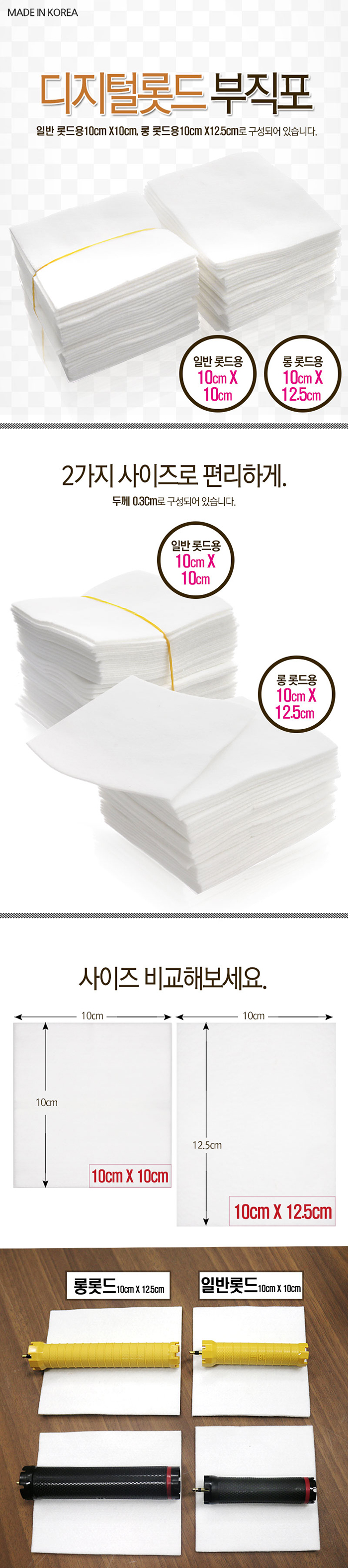 | 제품의 특징 - 디짙털 셋팅 부직포 - 부직포 두께가 앏아 디지털 롯드에 사용하기 편리합니다. - 디지털롯드 (일반 롯드용) : 10 x 10 cm - 디지털롯드 (롱 롯드용) : 10x12.5cm - 위 사이즈 대로 일반사이즈의 롯드는 중형, 롱롯드는 대형을 사용하시기 바랍니다. |