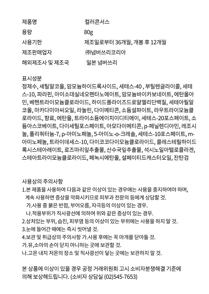 | 1. 본 제품을 사용하여 다음과 같은 이상이 있는 경우에는 사용을 중지하여야 하며, 계속 사용할 경우 증상을 악화시키므로 피부과 전문의 등에게 상담할 것. 가. 사용 중 붉은 반점, 부어오름, 자극 등의 이상이 있는 경우. 나. 적용부위가 직사광선에 의하여 위와 같은 증상이 있는 경우. 2. 상처있는 부위, 습진, 피부염 등의 이상이 있는 부위에는 사용을 하지 말 것. 3. 눈에 들어갔을 때에는 즉시 씻어낼 것. 4. 보관 및 취급상의 주의사항 가. 사용 후에는 꼭 마개를 닫아둘 것. 나. 유아·소아의 손이 닿지 아니하는 곳에 보관할 것. 다. 고온 내지 저온의 장소 및 직사광선이 닿는 곳에는 보관하지 말 것. |