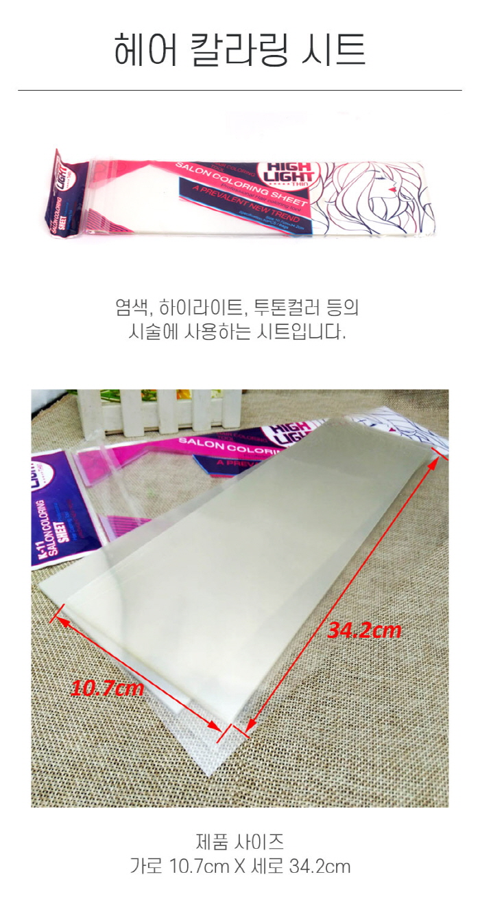| [가로 10.7cm * 세로 34.2cm] 염색, 하이라이트, 투톤컬러 등의 시술에 사용하는 시트입니다. | |