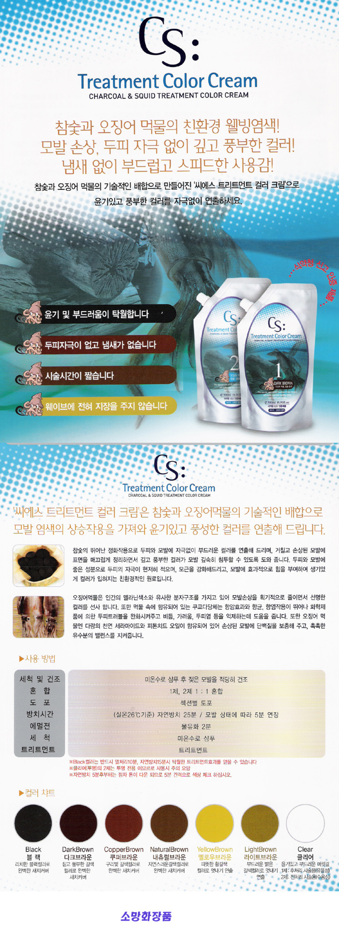 | 제품의 특징 - 윤기 및 부드러움이 탁월하고 두피자극이 없고 냄새가 없습니다. - 시술시간이 짧으며, 웨이브에 전혀 지장을 미치지 않습니다. - 씨에스 트리트먼트 컬러 크림은 모발 염색의 상승작용을 가져와 윤기있고 풍성한 컬러를 연출해 드립니다. - 새치전용 염모제로 기존의 염모제보다 많이 어둡게 나옵니다. |