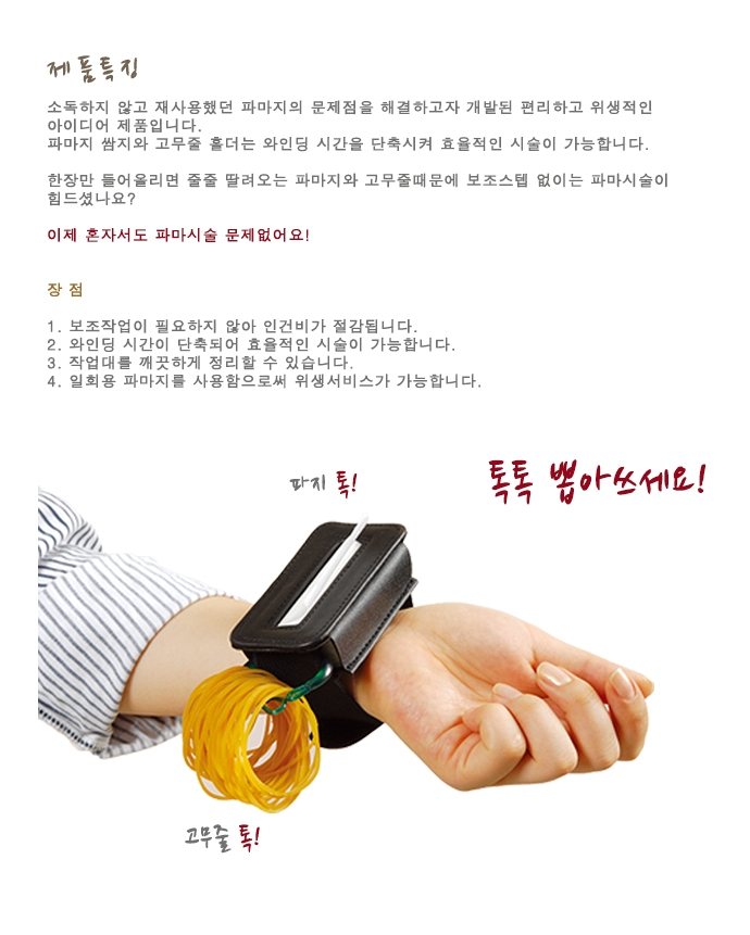 | 제품의 특징 - 쌈지를 손모목에 차고 파마지를 한장씩 뽑아서 사용합니다. - 손목에서 바로 뽑아서 사용하므로 롯드 와인딩시에 매우 편리합니다. - 파마 와인딩 속도가 빨라집니다. |