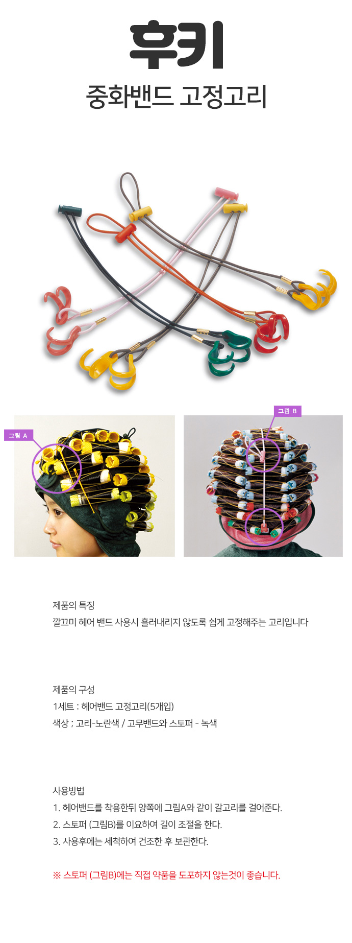 | 1세트 : 헤어밴드 고정고리(5개입) 색상 ; 고리-노란색 / 고무밴드와 스토퍼 - 녹색 | |