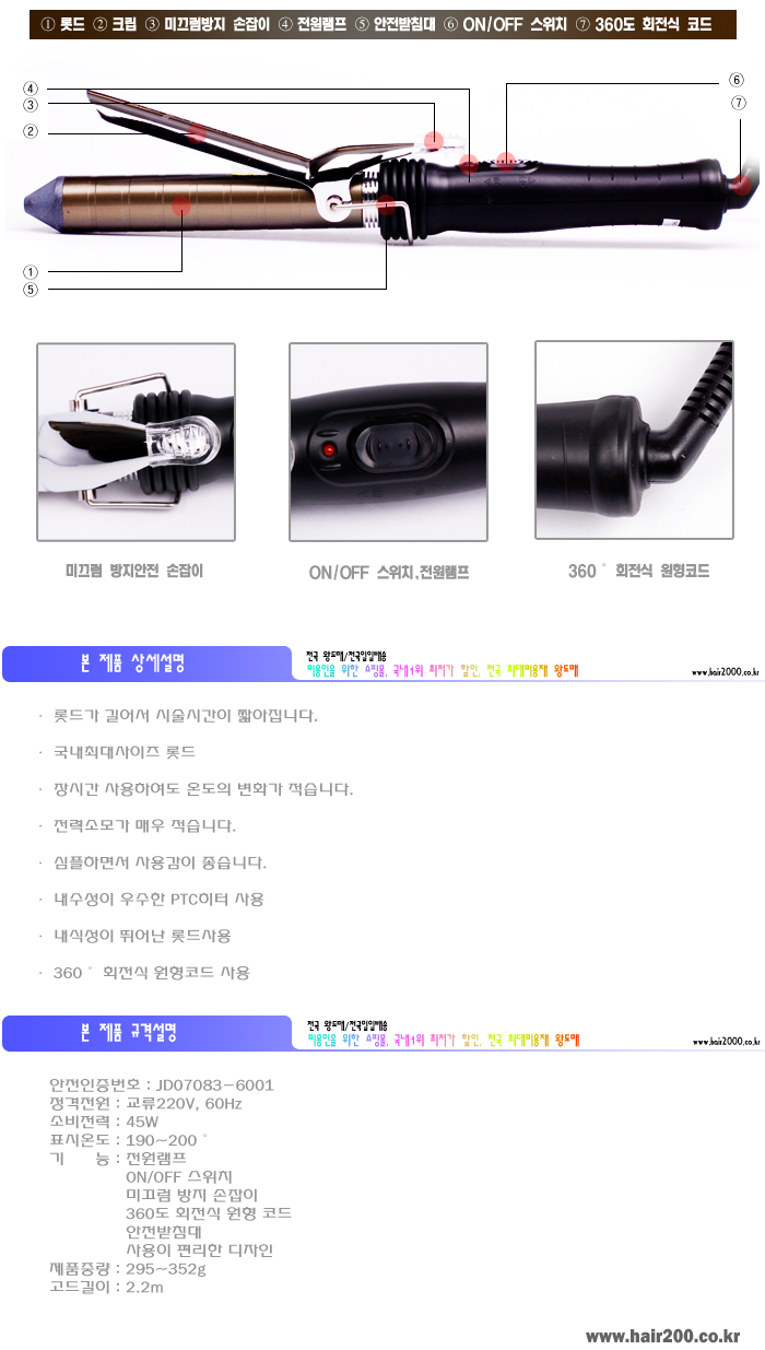| 제품의 특징 - 짧은 시간에 원하는 헤어스타일을 완성할 수 있는 충분한 열량 - 전력소모가 매우 적습니다. - 심플하면서 사용감이 좋습니다. - 롯드가 길어서 시술시간이 짧아집니다. - 내열성이 우수한 수지사용 - 내수성이 우수한 PTC히터 사용 - 내식성이 뛰어난 롯드사용 - 360도 회전식 원형코오드 사용 - 국내최대사이즈 롯드 (22mm,25mm,28mm,31mm) - 장시간 사용하여도 온도의 변화가 적습니다. |