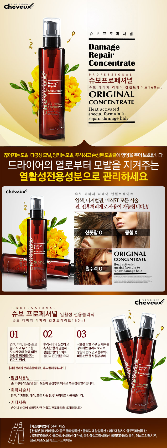 | [제품의특징] - 각종 화학적 시술로 갈라지고 손상된 모발과 열로부터의 손상을 방어합니다. -모발 뭉침없이 빠르게 모발에 흡수되어 사용감이 산뜻합니다. - 프랑스산 고급 후리지아 향이 기분까지 상쾌하게 합니다. 01. 염색, 퍼머, 탈색등으로 늘어지고 부스스한 모발케어와 열에 의한 마찰을 방어해 주는 방어막 형성 02. 후리지아의 신선하고 촉촉한 향과 달콤하고 상큼한 향의 조화로 심신의 편안함을 유지 03. 극손상 모발 외부 및 내부를 강화하는 클리닉 효과로 뭉침이 전혀 없고 흡수력이 빠른 산뜻한 사용감 부여 |