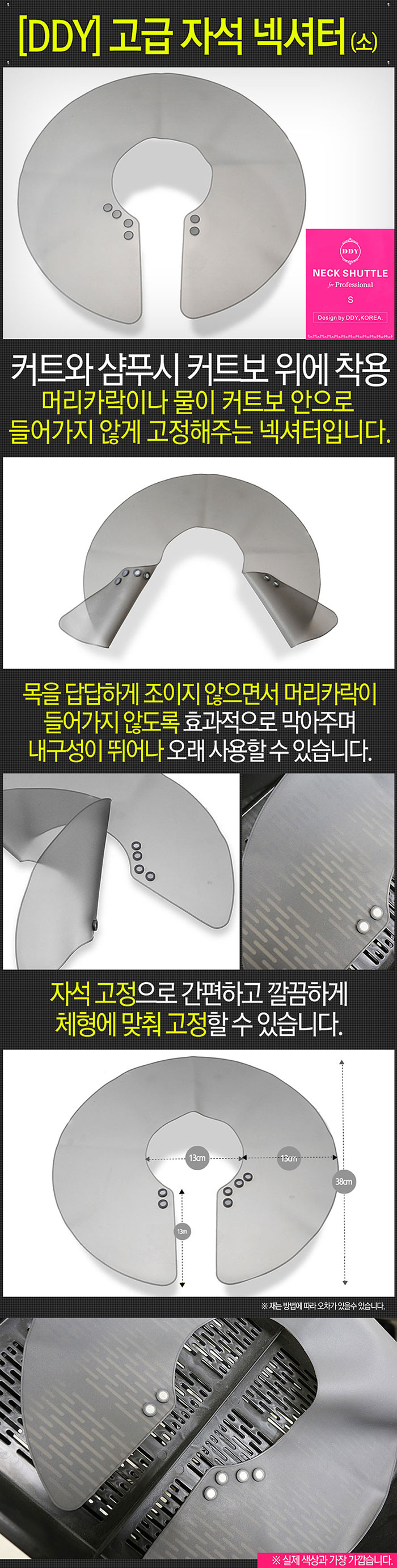 | 넥셔터 소 무게 : 0.4kg 커트 와 샴푸 시 옷깃의 움직임을 고정시켜 안정적으로 시술할수 있도록 도와준다 끝부분에 자석이 있어서 고정시킬수 있다 |