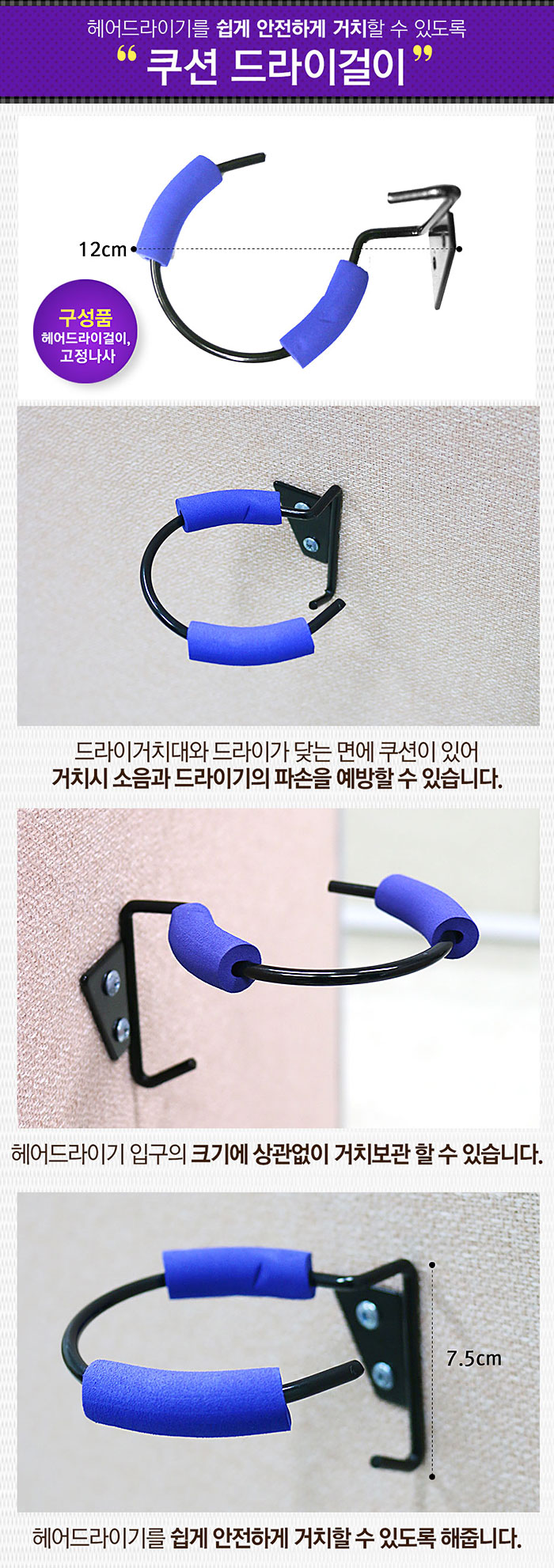 | 드라이걸이 구성품 : 헤어드라이걸이, 고정나사 색상 ; 검정 , 파랑 헤어드라이기를 쉽게 안전하게 거치할수 있도록 한다 헤어드라이기 입구의 크기에 상관없이 거치보관할수 있다 치드라이거치대와 드라이가 닺는 면에 쿠션이 있어 거치시 소음과 드라이기의 파손을 예방할수 있다 |