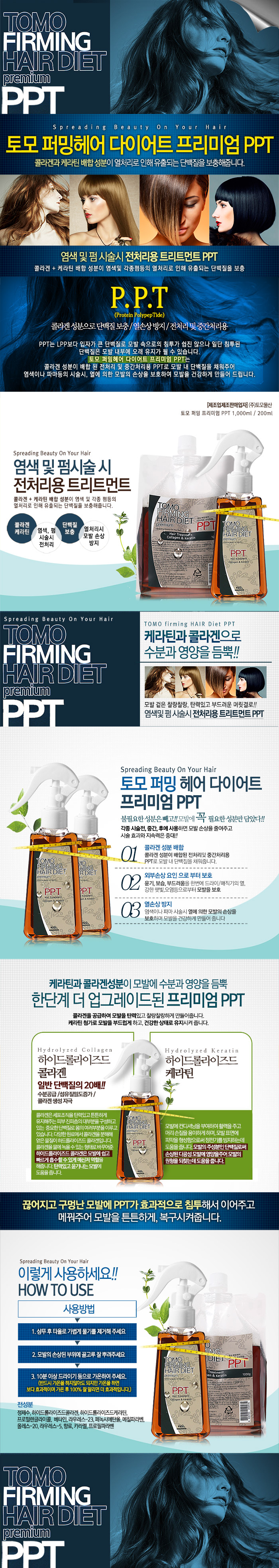 | 염색 및 펌 시술시 전처리용 트리트먼트 PPT(콜라겐+케라틴)/콜라겐 성분이 배합된 전처리및 중간처리용 PPT로 모발 내 단백질을 채워줍니다./염색이나 파마 시술시 열에 의한 모발의 손상을 보호 | |
