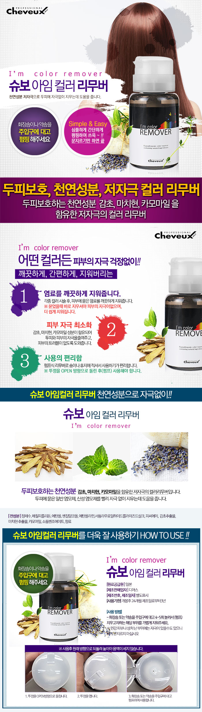 | [제품의특징] - 두피를 보호하는 천연성분(감초,마치현,카모마일)을 함유한 저자극의 컬러 리무버입니다. 두피에 묻은 일반 염모제, 산성염모제를 빨리 자극어벗이 지우는데 도움을 줍니다. |