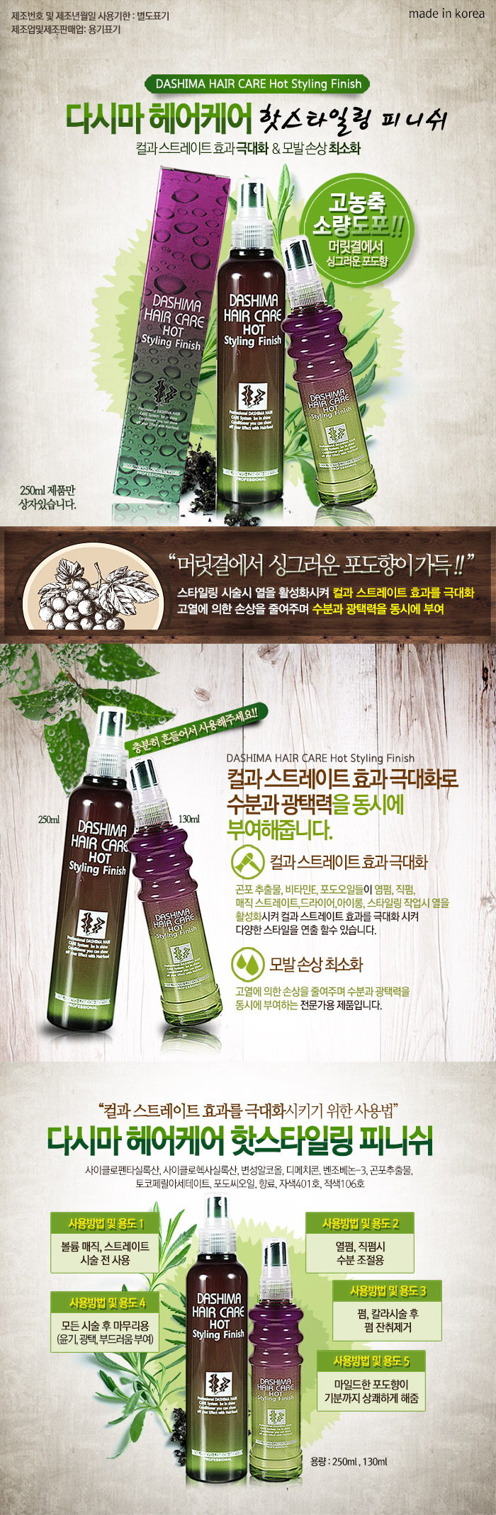 | [제품의특징] - 머릿결에서 싱그러운 포도향이 가득 ■ 컬과 스트레이트 효과 극대화 _ 곤포 추출물, 비타민E, 포도오일들이 염펌, 직펌, 매직 스트레이트,드라이어,아이롱, 스타일링 작업시 열을 활성화시켜 컬과 스트레이트 효과를 극대화 시켜 다양한 스타일을 연출 할수 있습니다. ■ 모발 손상 최소화 - 고열에 의한 손상을 줄여주며 수분과 광택력을 동시에 부여하는 전문가용 제품입니다. |
