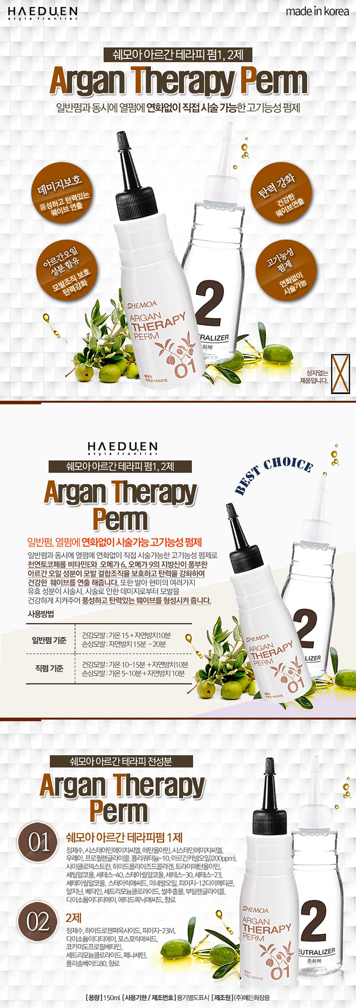 | 1제 정제수, 시스테인에이치씨엘, 시스테아민에이치씨엘, 에탄올아민, 세트리모늄클로라이드, 우레아, 프로필렌글라이콜, 아르간 트리커넬 오일(15mg), 미네랄오일, 부틸렌글라이콜, 피이지-12 디메치콘, 세테애씨드, 세테스-23, 세테스 -30, 세테스-40, 디소듐이디티에이, 에티드로닉애씨드, 트리에탄올아민 2제 정제수, 하이드로젠퍼옥사이드, 피이지-23M , 코카미도프로필 베타인, 세트리모늄클라이라드, 디소듐이디티에이, 포스포릭애씨드,페나세틴, 노녹시놀-10, 향료 | |