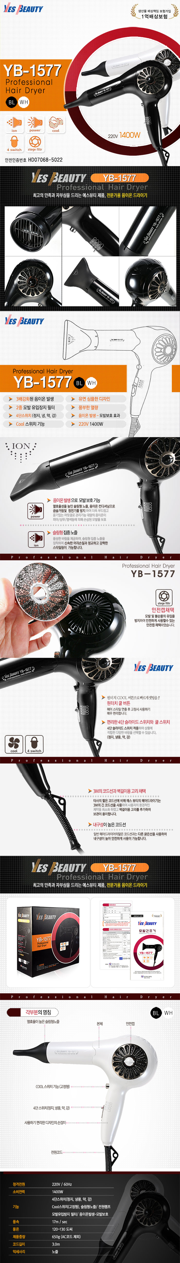| 모델명 : YB-1577</br> 안전인증번호 : HD07068-5022</br> 정격전원 : AC220V/60Hz</br> 기능 : 4단스위치(정지,냉풍,약,강),Cool 스위치,슬림형노즐,이중모발유입방지 필터,음이온발생-모발보호효과</br> 풍속 : 17m/sec</br> 풍온 : 120도~130도</br> 제품중량 : 650g</br> 코드길이 : 3.0m</br> 악세사리 : 노즐 | |