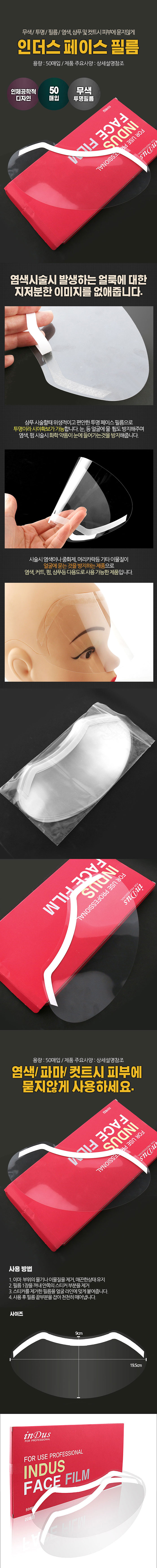 | 응용방법 1.염색을 시술한 때 고객의 목 사이즈에 맞게 페이스필름을 잘라 붙이고 모발끝을 도포하면 목에 염색약이 묻어 얼룩이 생기는 것을 방지할 수 있어 고객에게 염색시술에 발생되는 얼룩에 대한 지저분한 이미지를 없애고 깔끔하게 시술이 진행되는 이미지를 전달해 줄수 있습니다. 2.전체적인 호일링이 필요할 시에 일일이 호일을 대고 핀셋으로 고정할 필요없이 앞, 뒤의 페이스 필름을 받침으로 사용하여 호일을 올려 고정함으로 인해 호일의 양을 줄여 간편하게 작업할 수 있으며 무게감을 줄여 고객에게 가벼움을 줄 수 있습니다. 사용방법 1.고객의 페이스라인을 따라 물기를 제거합니다. 2.페이스라인캡 1장을 꺼내 접착테이프의 겉지를 제거합니다. 3.제품의 접착면을 고객의 페이스라인을 따라 붙여줍니다. |