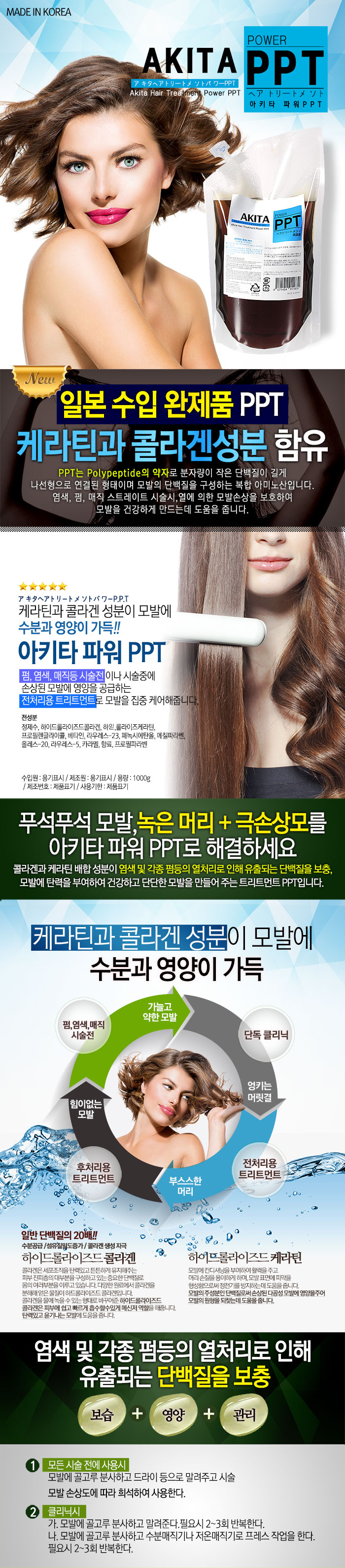 | [제품의특징] - 염색 또는 펌 시술시 전처리용으로 사용하는 트리트먼트 PPT 입니다. - 콜라겐과 케라틴 배합성분이 염색 및 각종 펌등의 열처리로 인해 유출되는 단백질을 보충, 모발에 탄력을 부여하여 건강하고 단단한 모발을 만들어 주는 트리트먼트 PPT 입니다. |