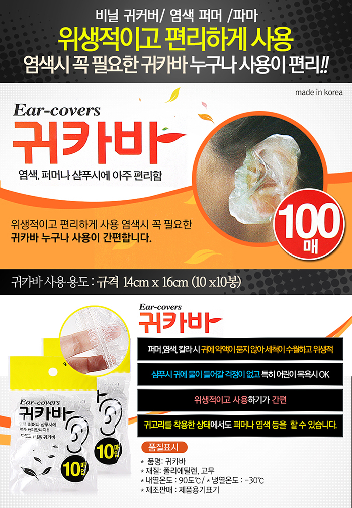 | [사용용도] - 퍼머,염색,칼라시 귀에 약액이 묻지 않아 세척이 수월하고 위색적이다. - 샴푸 시 귀에 물이 들어갈 걱정이 없고 특히 어린이 목욕시에 아주 좋습니다. - 위생적이고 사용하기가 간편합니다. - 귀고리를 착용한 상태에서도 퍼머나 염색등을 할 수 있어 더욱 편리합니다. |