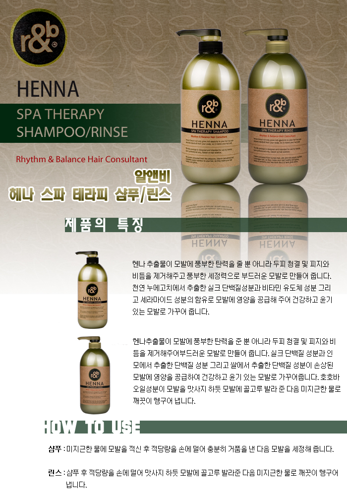 -헤나 추출물이 모발에 풍성한 탄력을 줄 뿐 아니라 두피 청결 및 피지와 비듬을 제거해주어 부드러운 모발을 만들어 줍니다. |