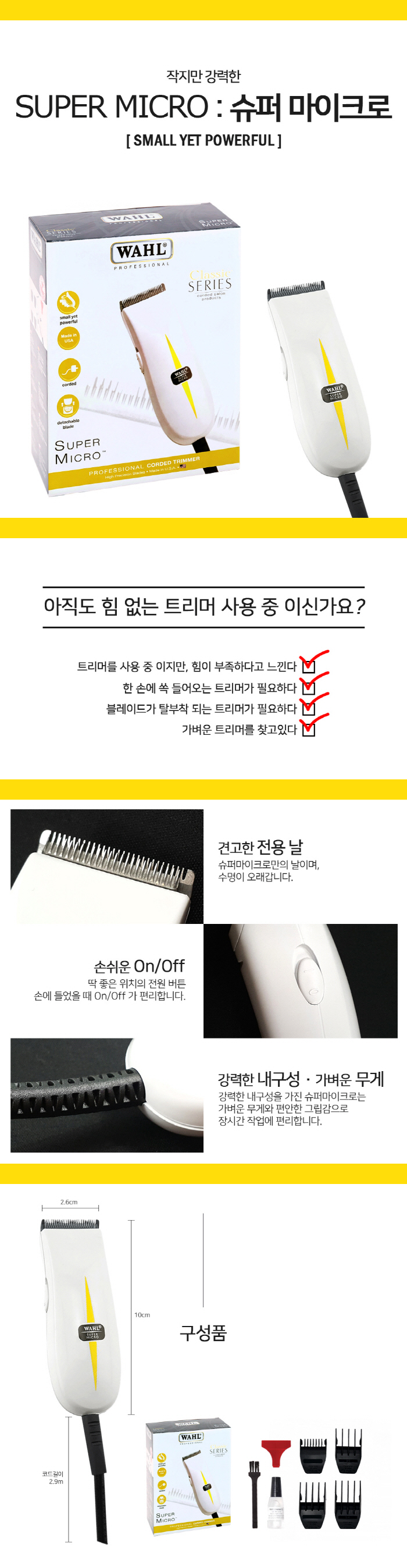 | 100년의 역사, 100년의 기업 전세계인의 사랑 받는 전통의 기업 WAHL 1919년 세계최초의 전자기식 헤어 클리퍼인 'Model 66'으로 부터 시작된 WAHL의 전통과 역사는 1911년 Sterling 고교 2년생이던 설립자 Leo.J.Wahl의 전가기 모터식 클리퍼의 발명을 모티브로 하고 있습니다. '강력하지만 조용한' 왈 만의 고유한 특성을 유지하면서도 지속적인 혁신을 멈추지 않는 지난 100년의 변화속에서 오직 사용자와 헤어에 집중한 경험과 기술력은 현재 미국과 영국, 독일 등 5개국 6개의 직영공장에서 철저한 관리하에 실현되어 전세계 165개국 이상의 전문 미용인의 선택으로 이어지고 있습니다. ■ 일반날의 40배 견고한 크롬날 장착 - 왈 사의 감점인 날의 견고함은 기존의 클리퍼의 날보다 40배 이상의 견고함을 갖고 있어 날의 수명도 오래갑니다. ■ 강력한 내구성/고성능 모터 장착 - 작지만 고성능 모터를 장착하여 강력한 회전을 자랑하는 슈퍼 마이크로는 강력한 내구성의 트리머로 지속적으로 장시간 작업이 가능하며 저중량 바리깡으로 편리한 그립감으로 편안한 작업이 가능합니다. ■ 작업에 용이한 2.9m 케이블 - 바리깡 사용시 넉넉한 길이의 케이블선으로 불편함을 최소화 합니다. ■ 안전을 생각한 블레이드 가드 - 불의의 사고를 예방하기 위하여 <블레이드 가드>를 씌운뒤 안전하게 보관이 가능합니다. |