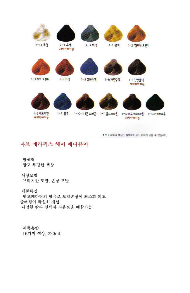 | 제품의 특징 - 사람의 모발에서 추출한 인모케라틴을 함유하여 손상된 모발을 트리트먼트하는 동시에 선명하고 밝은 칼라로 코팅해 줍니다. - 칼라 물빠짐을 개선하였으며 모발을 촉촉하고 매끄럽게 유지시켜줍니다. |