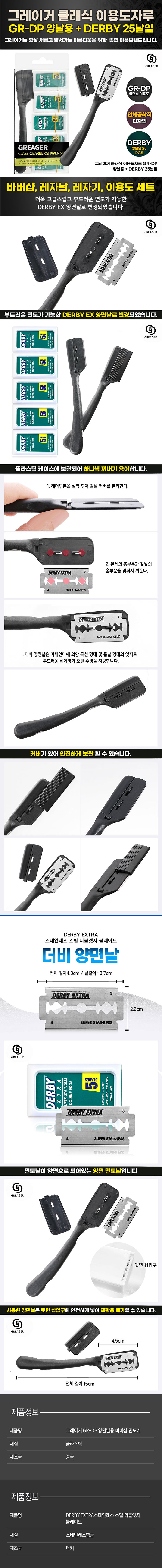 | - 품명 : 그레이거 GR-DP 양면날용 바버샵 면도기 - 재질 : 플라스틱 - 품명 : SHAICO 스테인레스 스틸 더블 엣지 블레이드 - 재질 : 스테인레스 | |