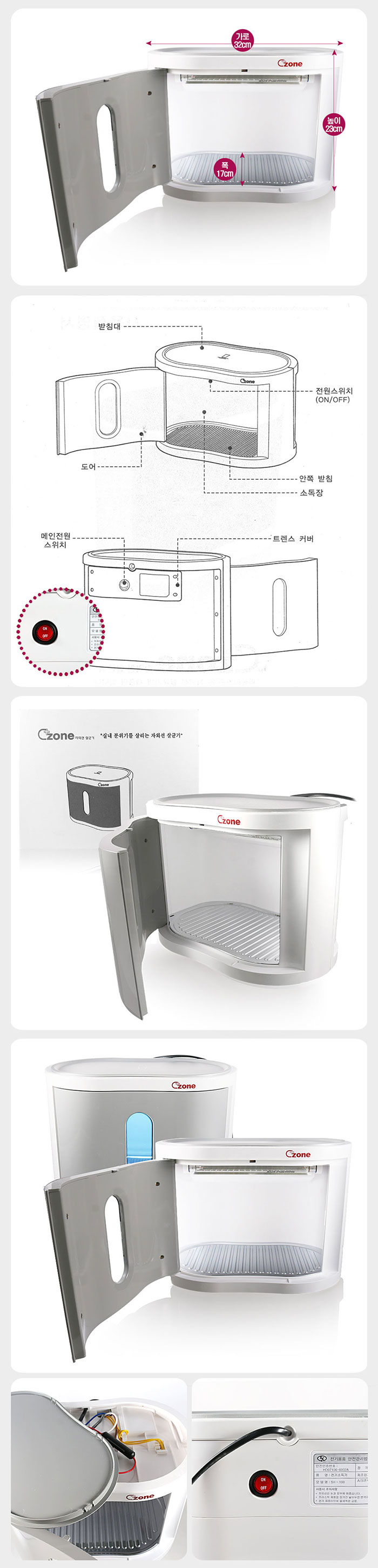 | 모델명:SH-100 C+ZONE 안전인증번호:HD07106-6002A 사이즈:320W*235D*200H(mm) 재질:ABS 정격:60Hz.7w 전원:220V 색상:적색 용도:컵.수저.손수건.행주.칼.가위등 램프수량:1개 소비전압:6W 무개:2.5kg 내장선반칸수:1단 | |