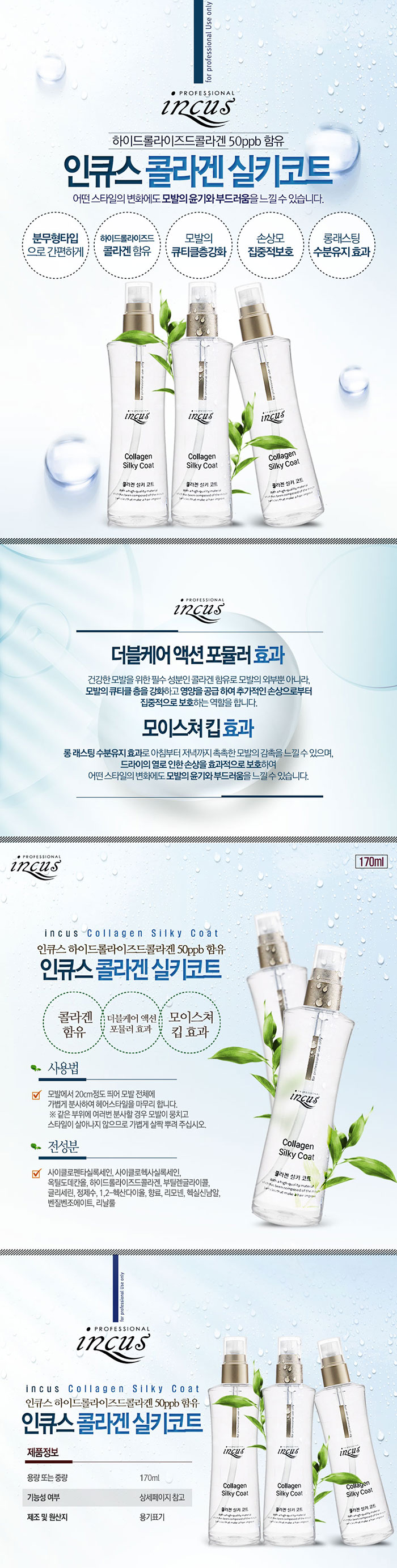 | 제품의 특징 - 인큐스만의 마이크로 콜라겐 입자들이 모발의 외부뿐 아니라 모발의 큐티클 층을 강화하고 영양을 공급하여 추가적인 손상으로부터 집중적으로 보호하는 역할을 합니다. - 롱래스팅 수분유지 효과로 아침부터 저녁까지 촉촉한 모발의 감촉을 느낄 수 있으며, 드라이의 열로 인한 손상을 효과적으로 보호하여 어떤 스타일의 변화에도 모발의 윤기와 부드러움을 느낄 수 있습니다. |