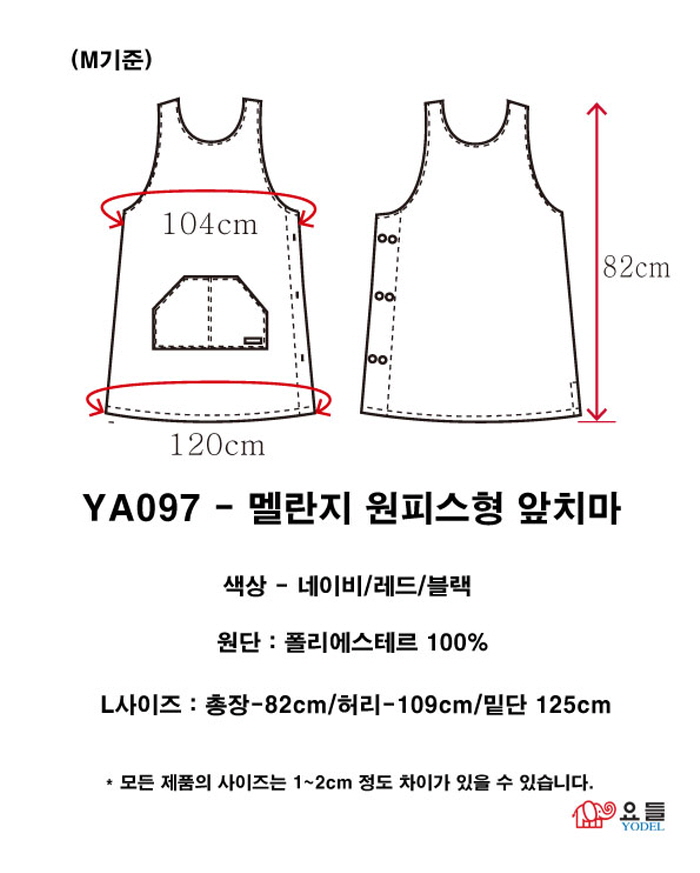 멜란지원피스형앞치마YA097-레드소비자 가격: 18,000원 SIZE : M/L(+1,000원) 색상 : 네이비/레드/블랙 소재 : 폴리에스테르 100% (발수처리 원단) |