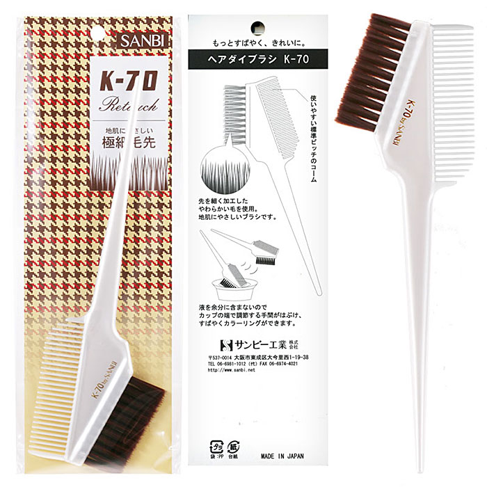 | [제품의 특징] - 발매 이래, 많은 이용사 분들께 사랑 받아 지속되어 온 K-60은 총 출하 개수 100만개를 돌파 일제로서의 신뢰성과 품질로 평가 되고 있습니다. - 참신한 12색의 칼라로 전국의 미용사를 놀래켰습니다. - K-70은 포화 폴리에스테르 수지라는 칫솔 등으로 사용되고 있는 초극세 브러쉬를 사용합니다. - 매우 부드러운 머리 염색 브러쉬로 두피가 자극 받지 않도록 도와줍니다. |
