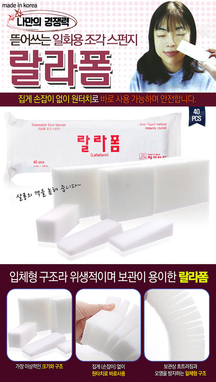 | [조각스펀지] 나만의 경쟁력 뜯어 쓰는 일회용 스펀지 / 위생적이고 원터치로 사용 가능하며 편리합니다. 일체형 구조라 위생적이며 보관이 용이합니다. | |