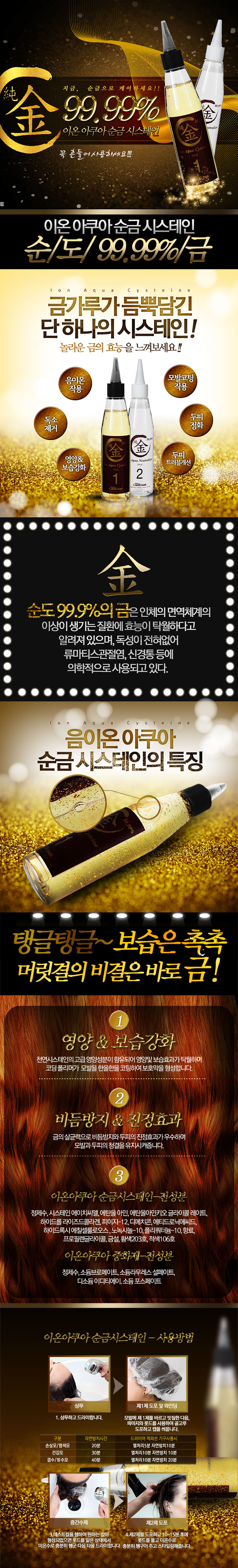 | 제품의 특징 - 순금 99.9% 함유, 꼭 흔들어 사용해야 금이온수 효과가 발생합니다. - 천연 시스테인의 고급성분이 함유되어 영양 및 보습효과가 탁월하며, 코팅 폴리머가 모발을 한올한올 코팅하여 보호막을 형성합니다. - 금의 살균력으로 비듬방지와 두피의 진정효과가 우수하며 모발과 두피의 청결을 유시지켜 줍니다. - 음이온 작용으로 인한 모발 코팅효과 탁월, 두피발열에 의한 혈액순환 촉진, 독소제거 및 두피정화 작업, 두피 트러블을 개선합니다. |