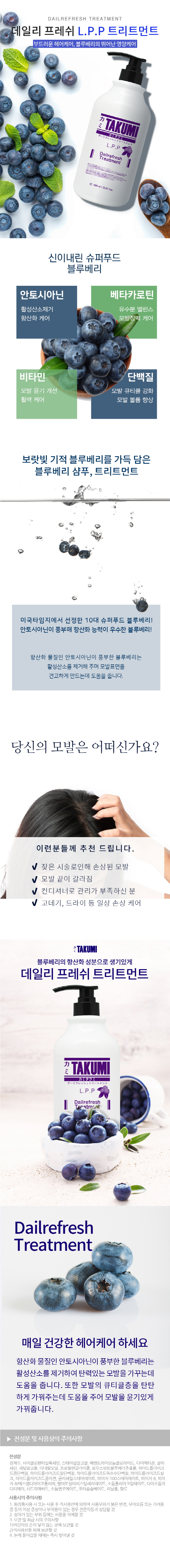 | 제품의 특징 - 항산화 물질인 안토시아닌이 풍부한 블루베리는 활성산소를 제거하여 탄력있는 모발을 가꾸는데 도움을 줍니다. - 또한 모발의 큐티클츠층을 탄탄하게 가꿔주는데 도움을 주어 모발을 ㅇ윤기 있게 가꿔 줍니다. ■ 안토시아닌 - 활성산소제거/ 황산화케어 ■ 베타카로틴 - 유수분 밸런스/모발장벽케어 ■ 비타민 - 모발윤기개선/활력케어 ■ 단백질 - 모발큐티클강화/모발 볼륨 향상 |