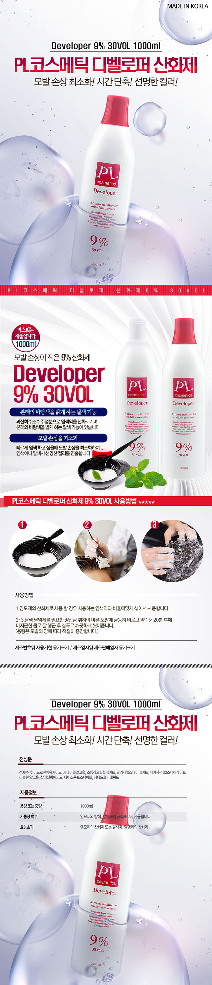 | 제품의 특징 - 피엘 디벨로퍼는 과산화수소수를 주성분으로 염색약을 산화시키며 본래의 바탕색을 밝게 하는 탈색기능이 있습니다. |