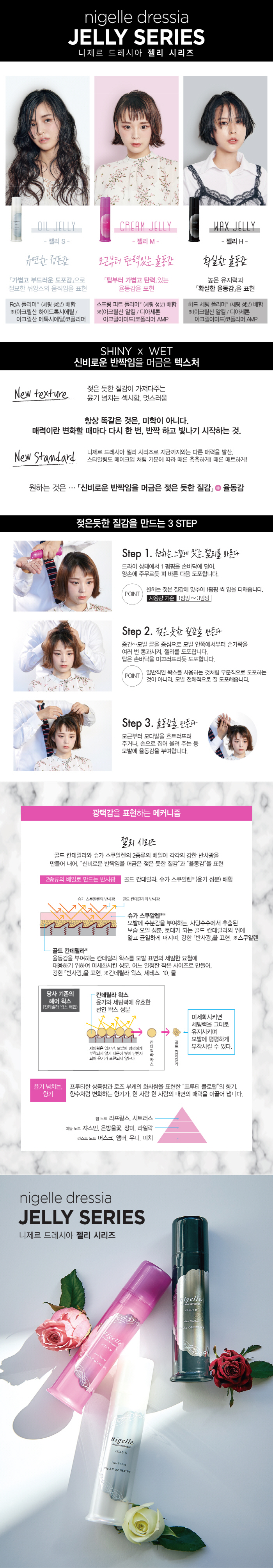 | 1. 드라이 상태에서 1펌핑을 손바닥에 덜어 양손에 주무르듯 펴 바른 다음 도포합니다. 2. 중간~모발 끝을 중심으로 모발 안쪽에서부터 손가락을 여러 번 통과시켜, 젤리를 도포합니다. 탑은 손바닥을 미끄러트리듯 도포합니다. 3. 모근부터 모다발을 흐트러트려 주거나 손으로 집어 올려 주는등 모발에 율동감을 부여합니다. |
