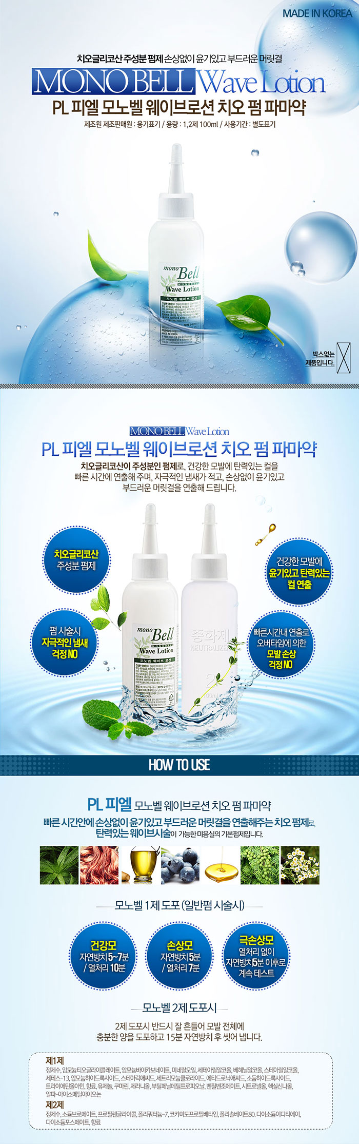 | 1제 : 정제수, 암모늄티오글라이콜레이트, 암모늄바이카보네이트, 미네랄오일, 세테아릴알코올, 베헤닐알코올, 스테아릴알코올, 세테스-13, 암모늄하이드록사이드, 스테아릭애씨드, 세트리모늄클로라이드, 애티드로닉애씨드, 소듐하이드록사이드, 트라이에탄올아민, 향료, 유제놀, 쿠마린, 제라니올, 부틸페닐메틸프로피오날, 벤질벤조에이트, 시트로넬올, 헥실신나몰, 알파-아이소메틸아이오논 2제 : 정제수, 소듐브로메이트, 프로필렌글라이콜, 폴리쿼터늄-7, 코카미도프로필베타인, 폴리솔베이트80, 다이소듐이디티에이, 다이소듐포스페이트, 향료 | |