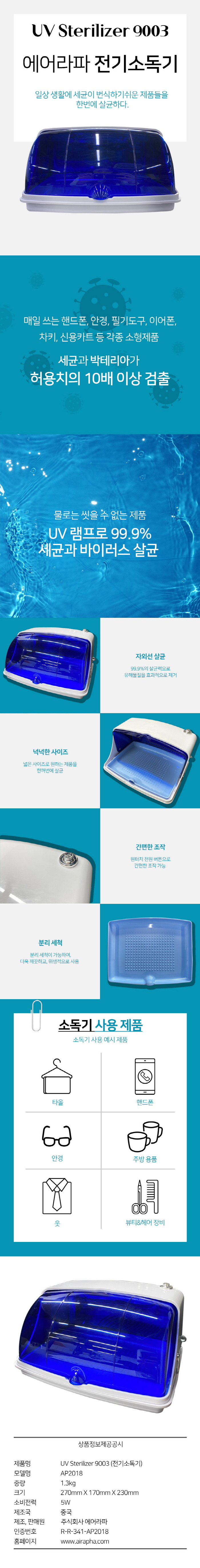 | 제품의 특징 ■자외선 살균 - 99.9% 살균력으로 유해물질을 효과적을 제거 ■넉넉한 사이즈 - 넓은 사이즈로 원하는 제품을 한꺼번에 살균 ■간편한 조작 - 원터치 전원 버튼으로 간편한 조작 가능 ■ 분리 세척 - 분리 세척이 가능하여, 더욱 깨끗하고, 위생적으로 사용 |