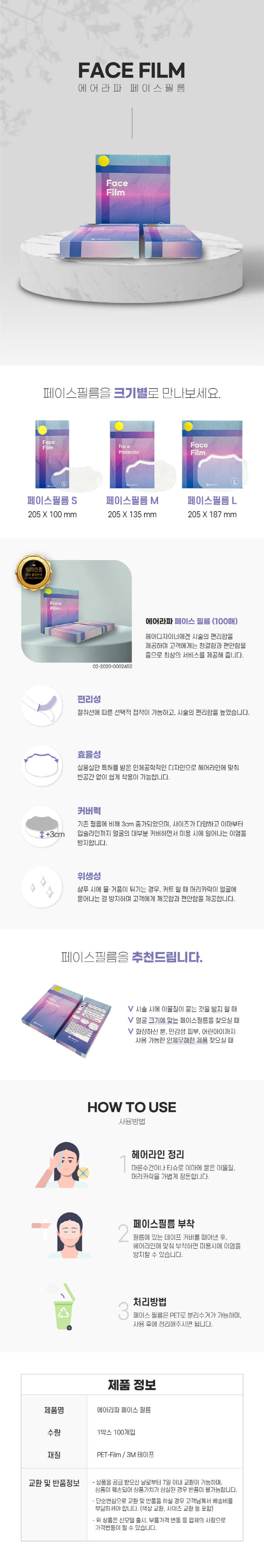 | [제품의 특징] ■효율성 - 실용실안 특허를 받은 인체공학적인 디자인으로 헤어라인에 맞춰 빈공간 없이 쉽게 착요이 가능합니다. ■커버력 - 기존 필름에 비해 3cm 증가되었으며, 사이즈가 다양하고 이마부터 입술라인까지 얼굴의 대부분 커버하면서 미용 시에 일어나는 이염을 방지합니다. ■위생성 -샴푸 시에 물,거품이 튀기는 경우, 커트 할때 머리카락이 얼굴에 묻어나는 걸 방지하며 고객에게 깨끗함과 편안함을 제공합니다. |