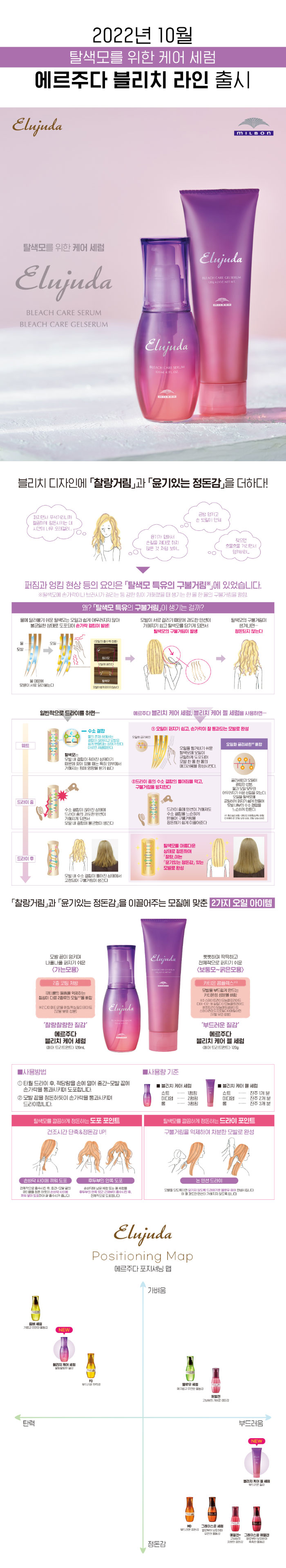 | 제품의 특징 -잘 정돈되지 않는 탈색모에 찰랑거림과 윤기부여 -뻣뻣하고 딱딱한 모발에 부드러운 질감을 표현 |