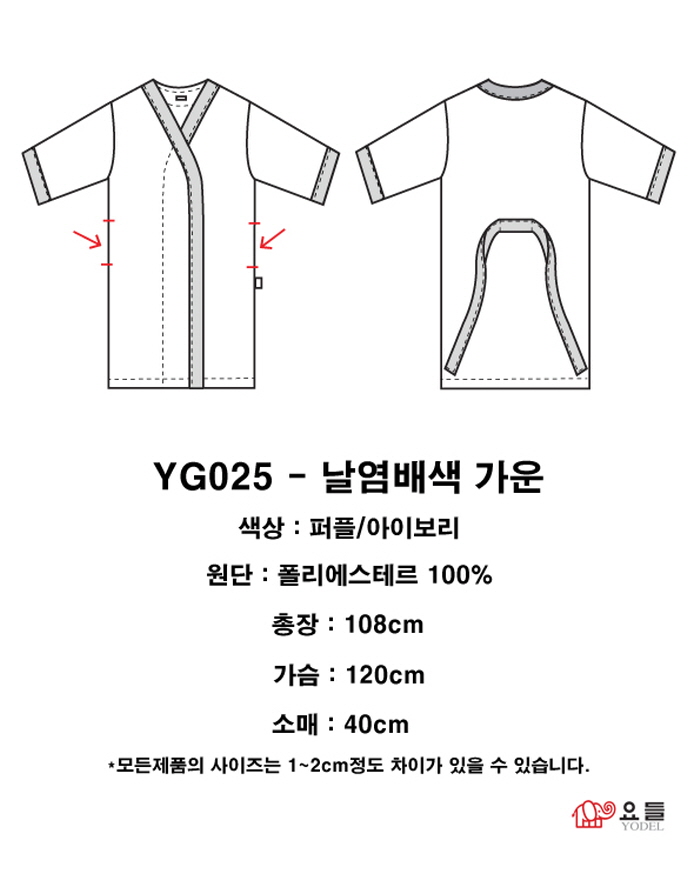 | 날염배색가운 YG025-아이보리 SIZE : FREE 색상 : 퍼플/아이보리 소재 : 폴리에스테르 100% | |
