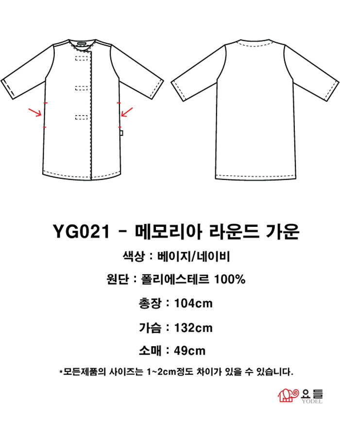 | 메모리아라운드 가운 YG021-베이지 SIZE : FREE 색상 : 베이지/네이비 소재 : 폴리에스테르 100% | |