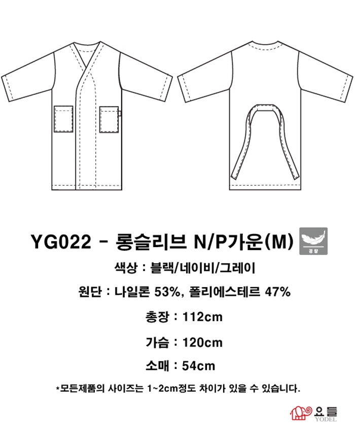| 롱슬리드 N/P 가운 YG022-네이비 SIZE : FREE 색상 : 블랙/네이비/그레이 소재 : 나일론 53% 폴리에스테르 47% | |