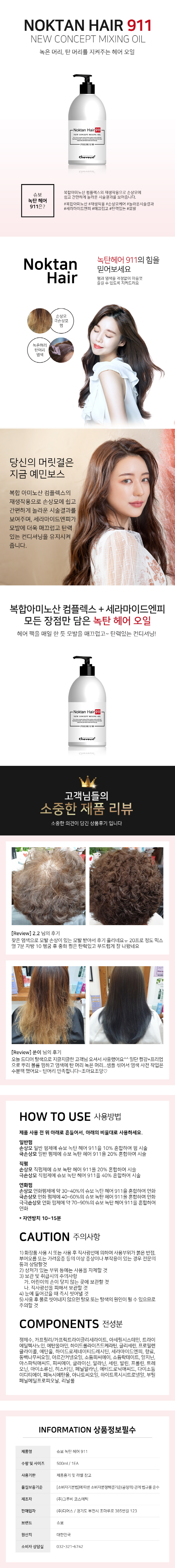 | 사/용/방/법 제품 사용 전 위 아래로 흔들어서 아래의 비율대로 사용하세요 ■ 일반펌 - 손상모 : 일반펌제 슈보 녹탄헤어 911을 10% 혼합하여 펌 시술 - 극손상모 : 일반펌제에 슈보 녹탄헤어911을 20% 혼합하여 시술 ■ 직펌 - 손상모 : 직펌에에 슈보 녹탄헤어 911을 20% 혼합하여 시술 - 극손상모 : 직펌제에 슈보 녹타헤어911을 40%% 혼합하여 시술 ■ 연화펌 - 손상모 : 연화펌제에 약 30~40%의 슈보 녹탄헤어 911을 혼합하여 연화 - 극손상모 : 연화펌제에 40~60%의 슈보 녹탄헤어 911을 혼합하여 연화 - 극극손상모 : 연화 펌제에 약70~90%의 슈보 녹탄헤어911을 혼합하여 연화 *자연방치 10~15분 |