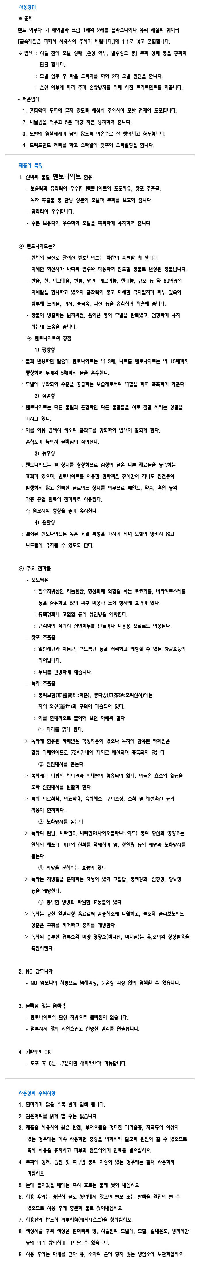 | 블 랙 : 1제= p페닐렌다아민, M-아미노페놀, m-페닐렌디아민, 레조시놀 다크브라운 : 1제= p페닐렌다아민, M-아미노페놀, 레조시놀, p-아미노페놀,a-나프톨 내추럴브라운 : 1제= p페닐렌다아민,M-아미노페놀,레조시놀,p-아미노페놀,p-아미노 2제= 과산화수소 35% | |