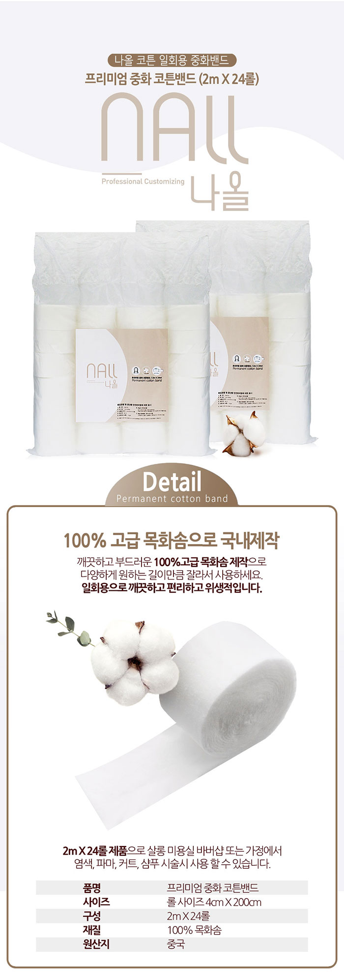 | 1봉에 24롤 들어있음 (약70명~75명사용가능) 프리미엄 중화 코튼밴드1롤 2m X 24롤입 / 중화할때 사용하기 너무 좋아요. | |
