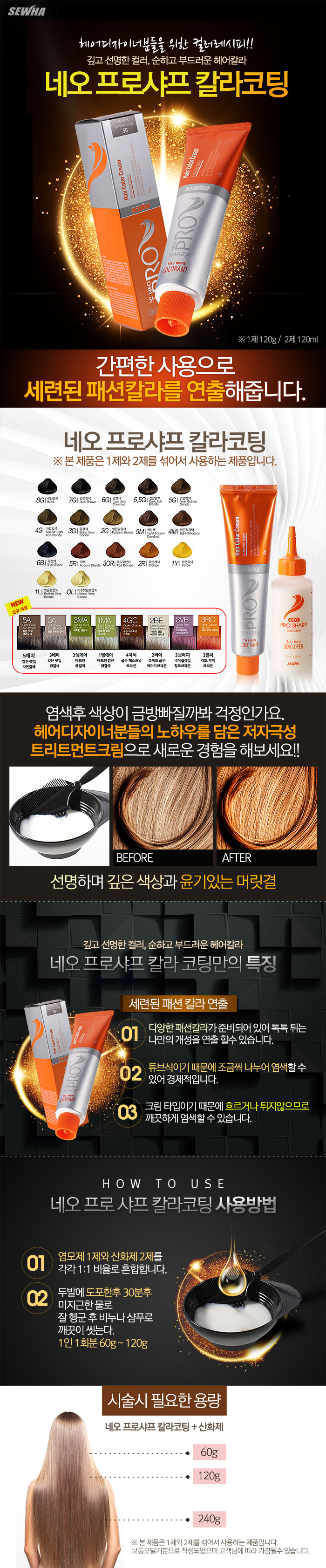 | 1제 염색약120g+2제 산화제120ml/염색 색상이 오래 지속됩니다. /독한 암모니아 냄새가 적어 손님과 시술자 모든 염색이 즐겁습니다. | |
