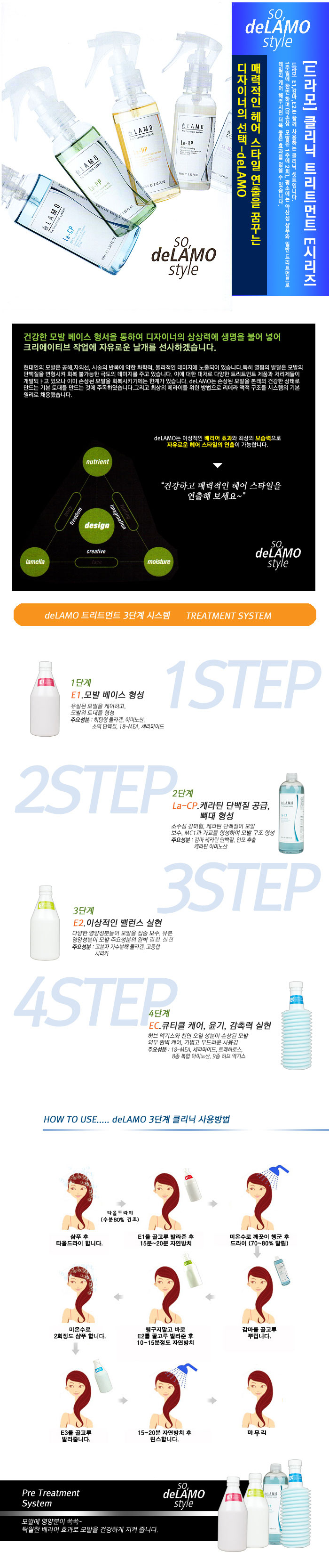 | 드라모 크리닉 트리트먼트 사용법 1. 모이스춰 샴푸로 샴푸합니다. 2. 가벼운 타올 드라이후 E1 트리트먼트를 도포(꼼꼼하게,얇게)하여 마사지 5분 후 깨끗이 행궤냅니다. 3. 뽀드득 소리가 날때가지 세정 드라이로 완전히 건조 시킵니다. 4. La-CP를 손상부 중심으로 촉촉하게 분사 후 냉풍 10~30초 가량 70% 건조 시켜줍니다. 5. 모발이 촉촉한 상태에서 E2를 도포하며 자연방치 10분을 해준 후 헹구어 줍니다. 6. EC를 전체적으로 균일하게 도포하고 2~3분간 마사지한 후 세정해 줍니다. (린스 사용하듯이 가볍게 마사지 해줍니다.) |
