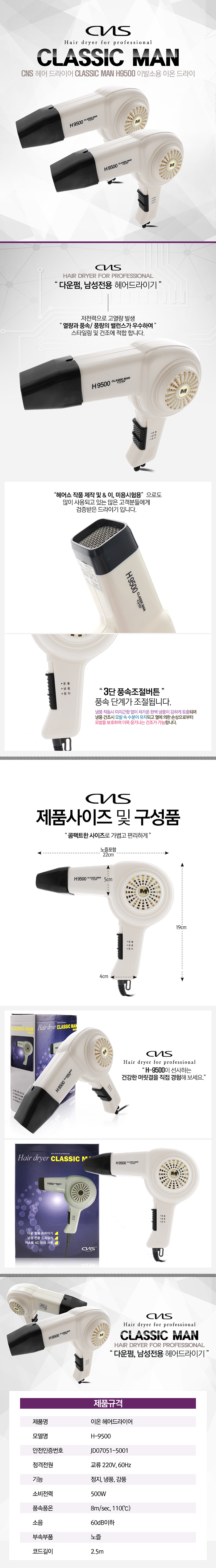 | 제품의특징 - 교류 220V, 저전력으로 고열량 발생하므로 머리손질이 용이함 - AC Motor 사용으로 저소음 채택 - 3단 스위치 채택 : 온풍 - 냉풍 - 정지 - 탈착식 노즐 - 이중 안전 장치 내장(1차 : 바이메탈, 2차 : 온도휴즈) |