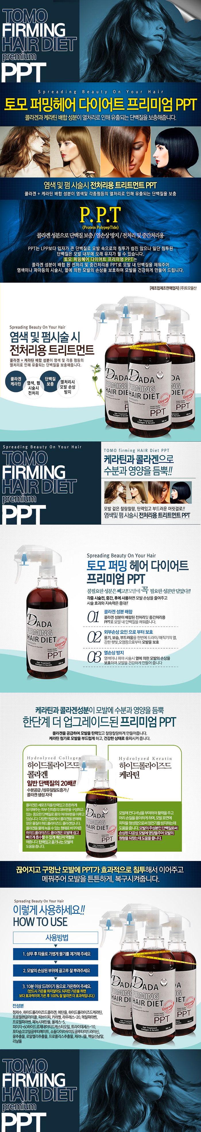 | 염색 및 펌 시술시 전처리용 트리트먼트 PPT(콜라겐+케라틴)/콜라겐 성분이 배합된 전처리및 중간처리용 PPT로 모발 내 단백질을 채워줍니다./염색이나 파마 시술시 열에 의한 모발의 손상을 보호하며 모발을 건강하게 만들어 줍니다 | |