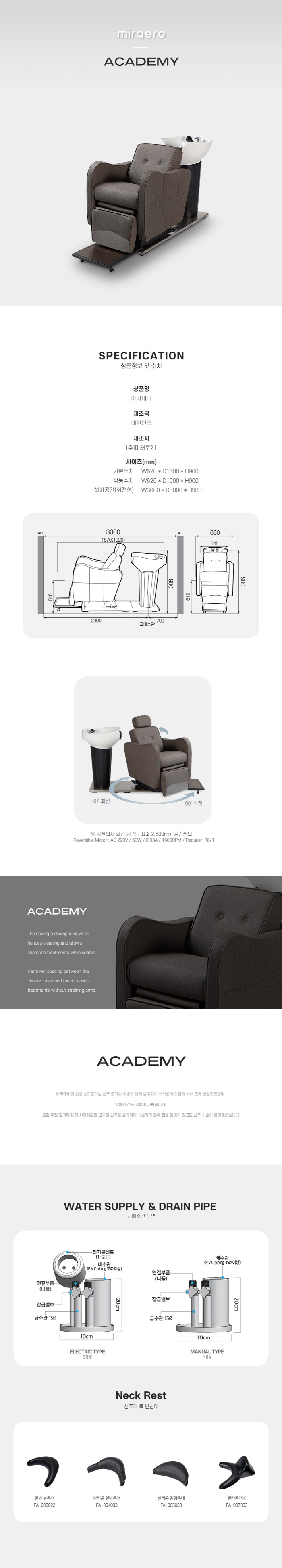 | 제품의 특징 - 도기 폭이 넓고 깊어 물 튀김을 최소화하고, 좌우 발판 스위치로 시술자 편의를 제공합니다. - 머리받침대가 장착되어 장시간 시술에도 목이 편안합니다. - 허리에 고급 스폰지를 채택한 인체공학적 샴푸 시스템을 갖추었습니다. 배송 운임 안내