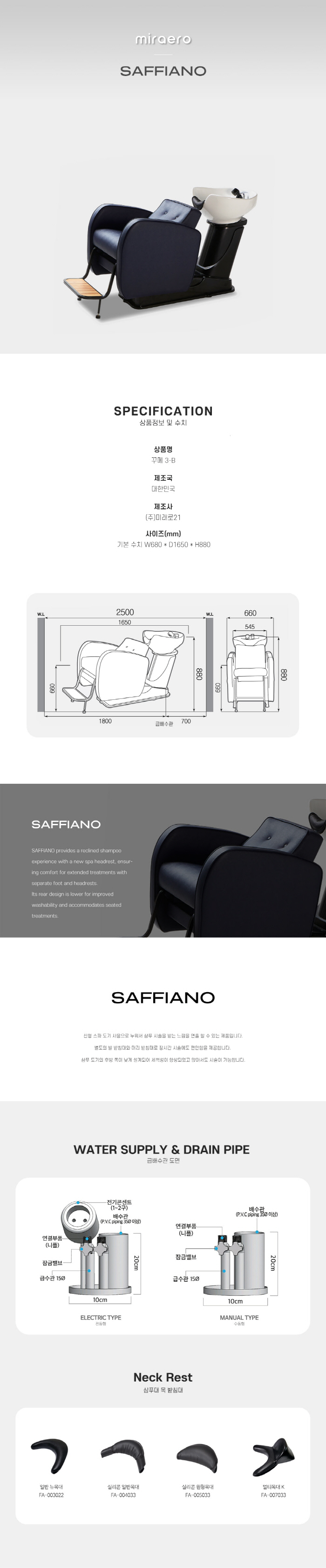 | 제품의 특징 - 신형 스파 도기 사용으로 누워서 샴푸 시술을 받는 느낌을 연출 할 수 있는 제품입니다. - 별도의 발 받침대와 머리 받침대로 장시간 시술에도 편안함을 제공합니다. - 샴푸 도기의 후방 쪽이 낮게 설계되어 세척성이 향상되었고 앉아서도 시술이 가능합니다. 배송 운임 안내