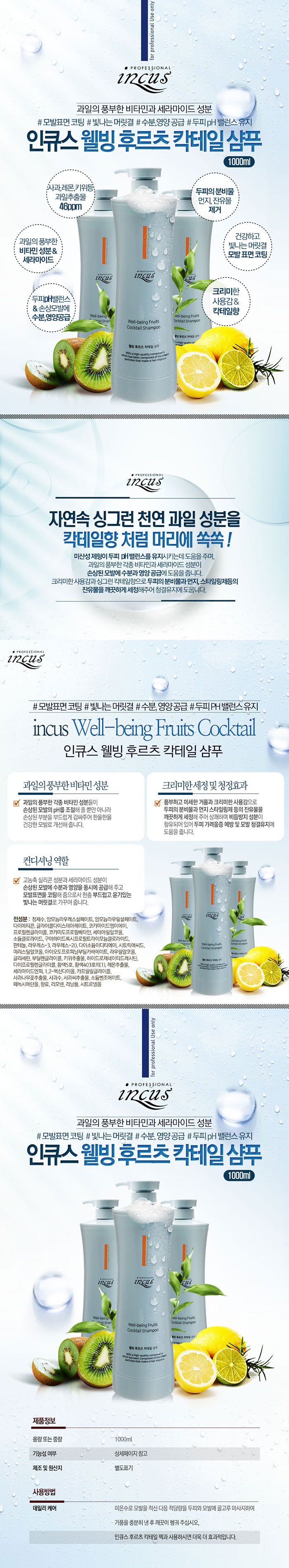 | 미온수로 모발을 적신 다음 적당량을 두피와 모발에 골고루 바르고 맛사지하여 거품을 충분히 낸 후 깨끗이 헹궈 내십시오. 인큐스 웰빙 후르츠 칵테일 팩과 함께 사용하시면 더욱 효과적입니다. |